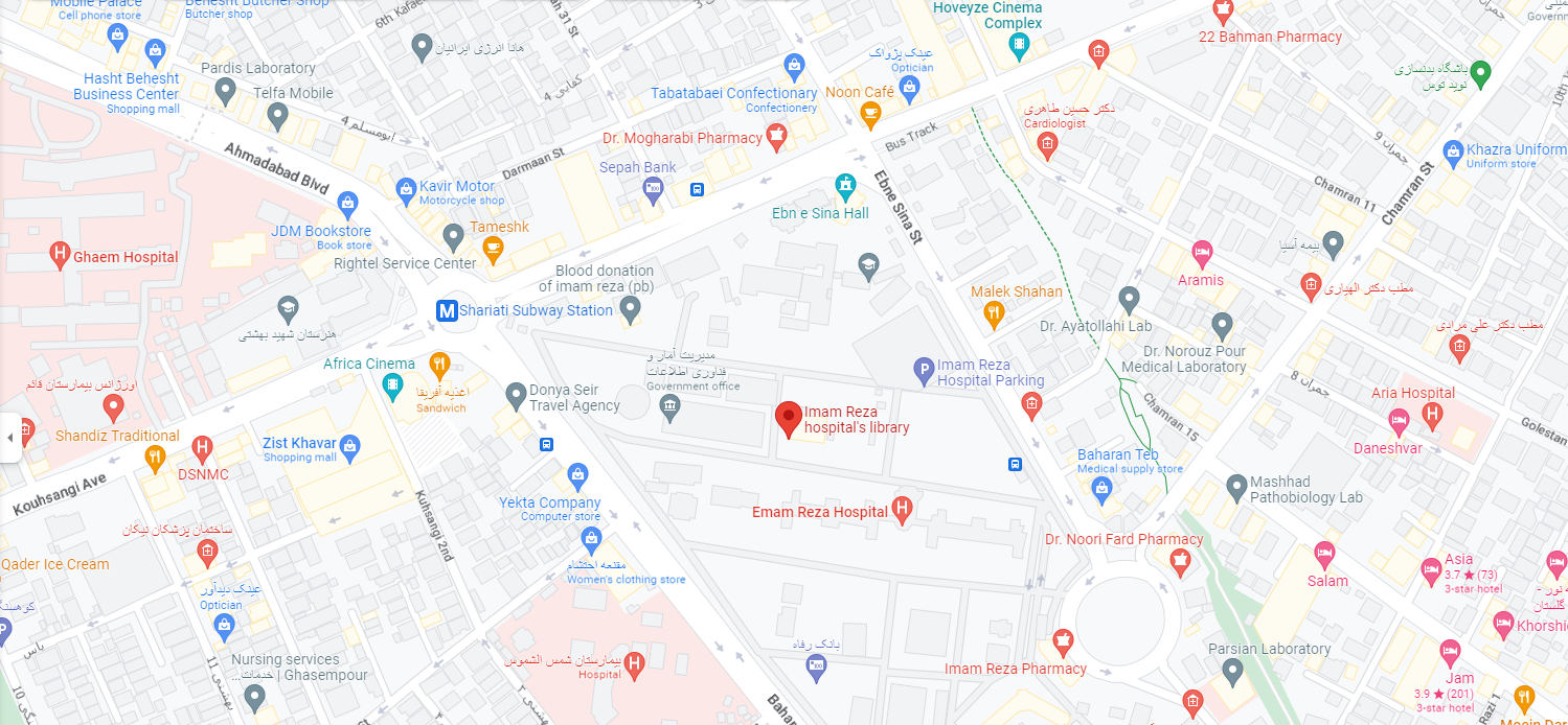 آدرس: مشهد، خیابان ابن سینا، مرکز آموزشی پژوهشی و درمانی امام رضا (ع) – کتابخانه